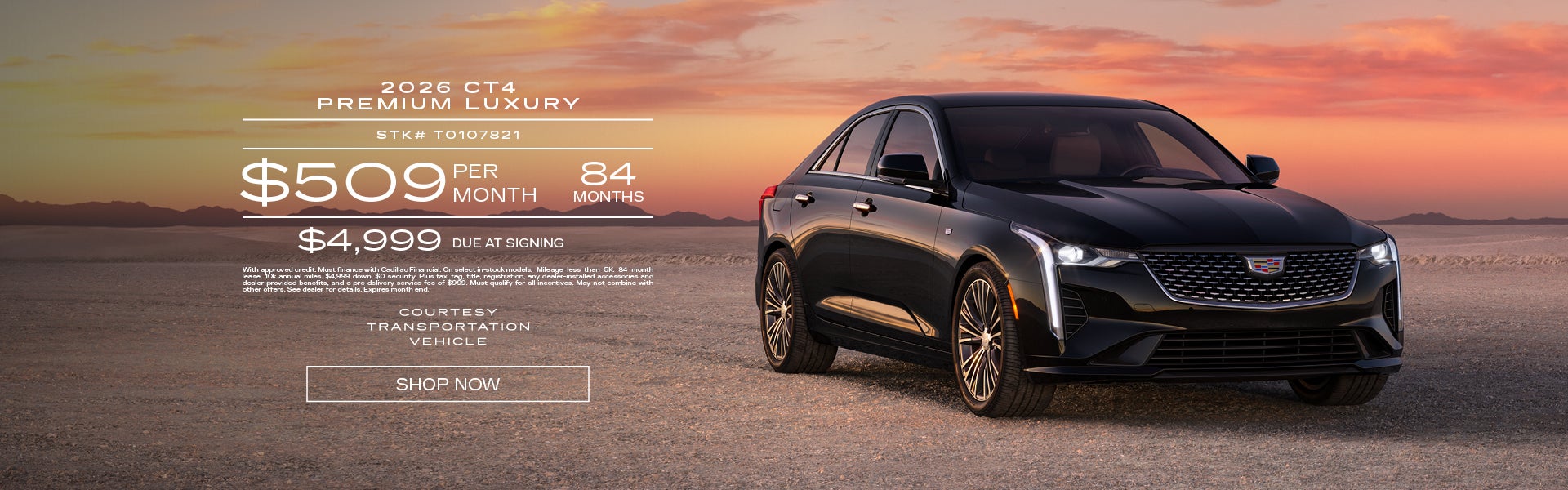 With approved credit. Must finance with Cadillac Financial. On select in-stock models. Mileage less than 5K. 84 month lease, 10k annual miles. $4,999 down. $0 security. Plus tax, tag, title, registration, any dealer-installed accessories and dealer-provided benefits, and a pre-delivery service fee of $999. Must qualify for all incentives. May not combine with other offers. See dealer for details. Expires 4/30/26.
