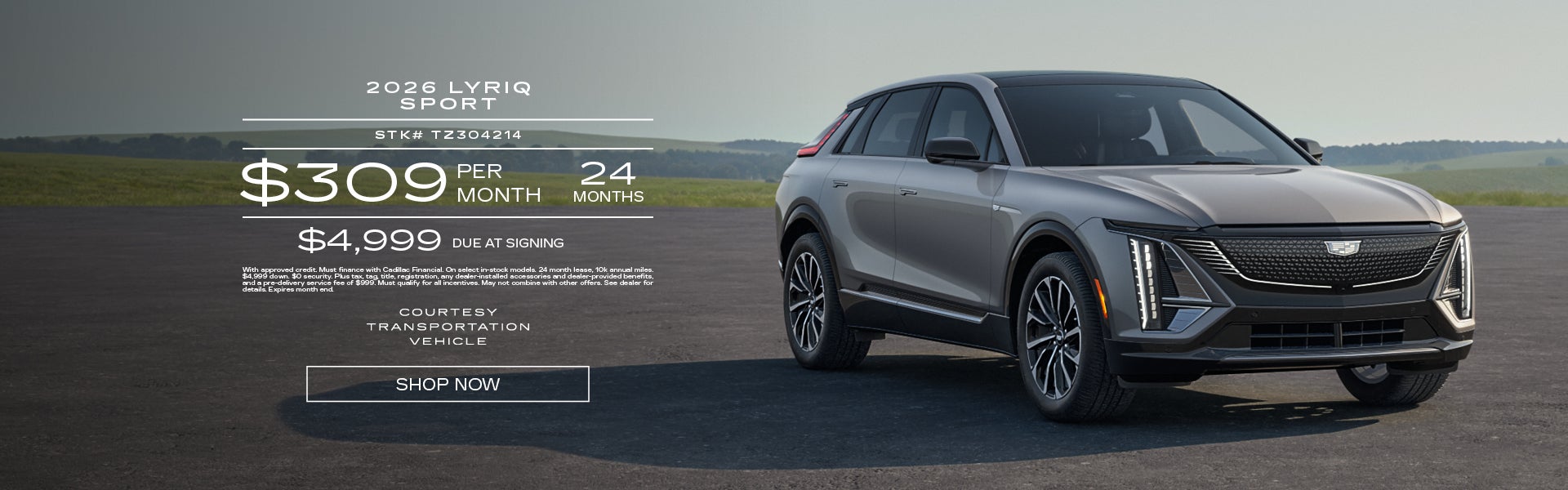 With approved credit. Must finance with Cadillac Financial. On select in-stock models. 24 month lease, 10k annual miles. $4,999 down. $0 security. Plus tax, tag, title, registration, any dealer-installed accessories and dealer-provided benefits, and a pre-delivery service fee of $999. Must qualify for all incentives. May not combine with other offers. See dealer for details. Expires 3/31/26.