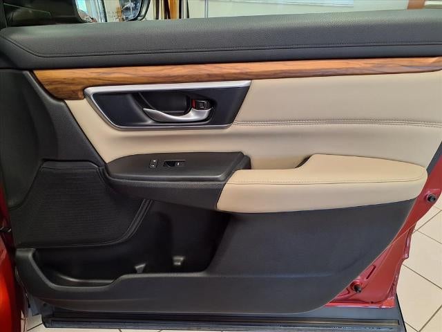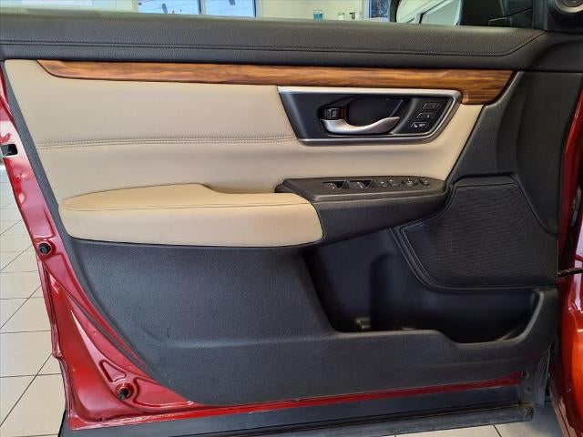 Equipped with CR-V Touring, 4D Sport Utility, 1.5L I4 DOHC 16V, CVT, AWD, Red, Ivory w/Leather Seat Trim, 18 Alloy Wheels, 4-Wheel Disc Brakes, 5.64 Axle Ratio, 9 Speakers, ABS brakes, Air Conditioning, Alloy wheels, AM/FM radio: SiriusXM, Apple CarPlay/Android Auto, Auto High-beam Headlights, Auto-dimming Rear-View mirror, Automatic temperature control, Blind Spot Information (BSI) System warning, Brake assist, Bumpers: body-color, Compass, Delay-off headlights, Driver door bin, Driver vanity mirror, Dual front impact airbags, Dual front side impact airbags, Electronic Stability Control, Exterior Parking Camera Rear, Forward collision: Collision Mitigation Braking System (CMBS) + FCW mitigation, Four wheel independent suspension, Front anti-roll bar, Front Bucket Seats, Front Center Armrest, Front dual zone A/C, Front fog lights, Front reading lights, Fully automatic headlights, Garage door transmitter: HomeLink, Heated door mirrors, Heated Front Bucket Seats, Heated front seats, Illuminated entry, Lane departure: Lane Keeping Assist System (LKAS) active, Leather Seat Trim, Leather Shift Knob, Low tire pressure warning, Memory seat, Navigation system: Honda Satellite-Linked Navigation System, Occupant sensing airbag, Outside temperature display, Overhead airbag, Overhead console, Panic alarm, Passenger door bin, Passenger vanity mirror, Power door mirrors, Power driver seat, Power Liftgate, Power moonroof, Power passenger seat, Power steering, Power windows, Radio data system, Radio: AM/FM/HD/SiriusXM Audio System, Rain sensing wipers, Rear anti-roll bar, Rear seat center armrest, Rear window defroster, Rear window wiper, Remote keyless entry, Roof rack: rails only, Security system, Speed control, Speed-sensing steering, Speed-Sensitive Wipers, Split folding rear seat, Spoiler, Steering wheel mounted audio controls, Tachometer, Telescoping steering wheel, Tilt steering wheel, Traction control, Trip computer, Turn signal indicator mirrors, and Variably intermittent wipers.