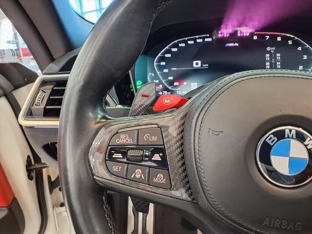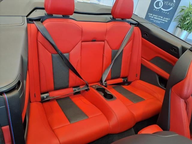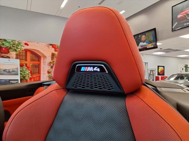 Equipped with M4 Competition, 2D Convertible, 3.0L I6 Turbocharged DOHC 24V LEV3-ULEV70 503hp, 8-Speed Automatic Steptronic, AWD, Alpine White, Fiona Red/Black Fiona Red/Black Extended Merin, 16 Speakers, 4-Wheel Disc Brakes, ABS brakes, Active Driving Assistant Pro, Adaptive suspension, Air Conditioning, Alloy wheels, AM/FM radio: SiriusXM, Apple CarPlay & Android Auto Compatibility, Auto High-beam Headlights, Auto-dimming door mirrors, Auto-dimming Rear-View mirror, Automatic temperature control, BMW Assist eCall, BMW TeleServices, Brake assist, Bumpers: body-color, Carbon Fiber Trim, Compass, ConnectedDrive Services, Convertible roof lining, Convertible roof wind blocker, Delay-off headlights, Driver door bin, Driver vanity mirror, Dual front impact airbags, Dual front side impact airbags, Electronic Stability Control, Emergency communication system: BMW Assist eCall, Enhanced USB/Bluetooth® Plus Smartphone Integration, Extended Merino Leather Upholstery, Extended Traffic Jam Assistant, Exterior Parking Camera Rear, Four wheel independent suspension, Front anti-roll bar, Front Bucket Seats, Front Center Armrest, Front dual zone A/C, Front reading lights, Front Ventilated Seats, Fully automatic headlights, Garage door transmitter, Glass rear window, harman/kardon Surround Sound System, harman/kardon® Speakers, Head-Up Display, Heated door mirrors, Heated front seats, Heated Steering Wheel, Illuminated entry, Integrated roll-over protection, Knee airbag, Leather Shift Knob, Live Cockpit Pro w/Navi, Low tire pressure warning, Lumbar Support, M Compound Brakes w/Red Calipers, M Drive Professional, M Shadowline Lights, M Sport Seats, Memory seat, Navigation System, Neck Warmer, Occupant sensing airbag, Outside temperature display, Overhead console, Panic alarm, Parking Assistant Plus, Passenger door bin, Passenger vanity mirror, Power convertible roof, Power door mirrors, Power driver seat, Power Front Seats, Power passenger seat, Power steering, Power windows, Radio data system, Radio: AM/FM Audio System, Rain sensing wipers, Rear air conditioning, Rear anti-roll bar, Rear reading lights, Rear seat center armrest, Rear window defroster, Remote Engine Start, Remote keyless entry, Security system, SiriusXM Satellite Radio, Speed control, Speed-sensing steering, Speed-Sensitive Wipers, Sport steering wheel, Steering wheel mounted audio controls, Tachometer, Telescoping steering wheel, Tilt steering wheel, Traction control, Trip computer, Turn signal indicator mirrors, Variably intermittent wipers, Wheels: 19 x 9.5 Fr/20 x 10.5 Rr (Style 826M), WiFi Hotspot, and Wireless Charging.