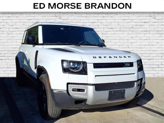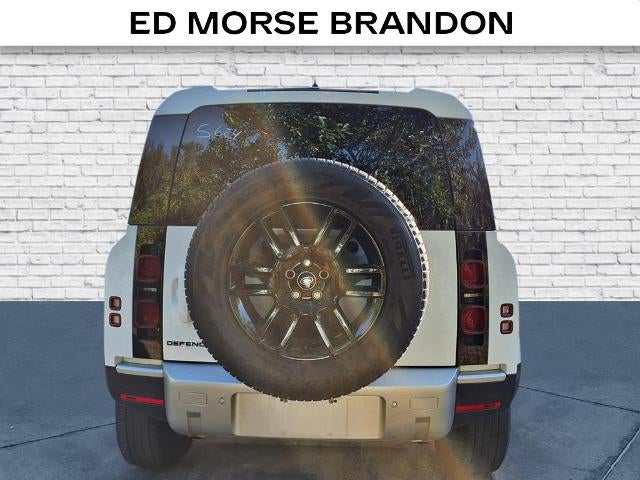 Equipped with Defender 110 S, 4D Sport Utility, 2.0L I4 DI Turbocharged, 8-Speed Automatic, AWD, Fuji White, Ebony w/Windsor Leather and Kvadrat Seat Trim, 11 Speakers, 12-Way Heated Electric Memory Front Seats, 4-Wheel Disc Brakes, ABS brakes, Air Conditioning, Alloy wheels, AM/FM radio: SiriusXM, Apple CarPlay & Android Auto, Auto High-beam Headlights, Auto tilt-away steering wheel, Auto-dimming door mirrors, Auto-dimming Rear-View mirror, Automatic temperature control, Brake assist, Bumpers: body-color, Compass, Delay-off headlights, Driver door bin, Driver vanity mirror, Dual front impact airbags, Dual front side impact airbags, Electronic Stability Control, Exterior Parking Camera Rear, Four wheel independent suspension, Front anti-roll bar, Front Bucket Seats, Front Center Armrest, Front dual zone A/C, Front fog lights, Front reading lights, Fully automatic headlights, Garage door transmitter: HomeLink, Heated door mirrors, Heated front seats, Heated steering wheel, Illuminated entry, Low tire pressure warning, Memory seat, Navigation system: Connected Navigation PIVI Pro, Occupant sensing airbag, Outside temperature display, Overhead airbag, Overhead console, Panic alarm, Passenger door bin, Passenger vanity mirror, Power door mirrors, Power driver seat, Power moonroof, Power passenger seat, Power steering, Power windows, Radio data system, Radio: Meridian Sound System, Rain sensing wipers, Rear anti-roll bar, Rear fog lights, Rear reading lights, Rear seat center armrest, Rear window defroster, Rear window wiper, Remote keyless entry, Resist and Resolve Seat Trim, Security system, Speed control, Speed-sensing steering, Speed-Sensitive Wipers, Split folding rear seat, Steering wheel memory, Steering wheel mounted audio controls, Tachometer, Telescoping steering wheel, Tilt steering wheel, Traction control, Trip computer, Variably intermittent wipers, Weather band radio, and Wheels: 19 Gloss Sparkle Silver Style 6010.